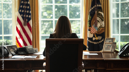 Demokratyczna kandydatka na prezydenta siedzi w Owalnym Gabinecie Białego Domu, za biurkiem symbolizującym władzę i odpowiedzialność.