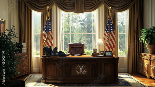 Starszy mężczyzna, kandydat Republikanów na prezydenta, siedzi za prestiżowym biurkiem w Owalnym Gabinecie.