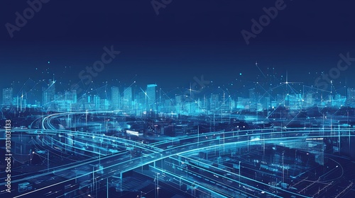 An intricate representation of a futuristic cityscape with advanced highways, emphasizing connectivity and efficient transport systems in a blue digital art style.