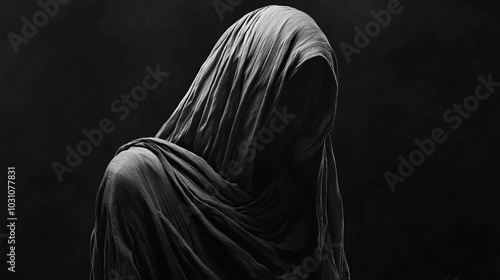 A mysterious figure wrapped in a dark cloth, shrouded in shadows on a black background. Generated using AI