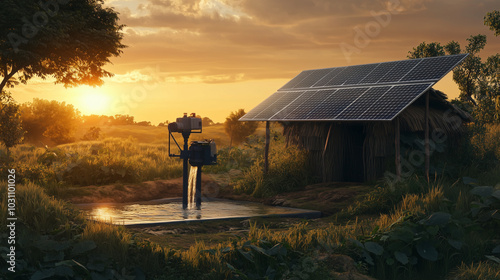 W malowniczym wiejskim krajobrazie, podczas zachodu słońca, panel słoneczny zasila pompy wodne, co stanowi doskonały przykład zrównoważonego zarządzania wodą.