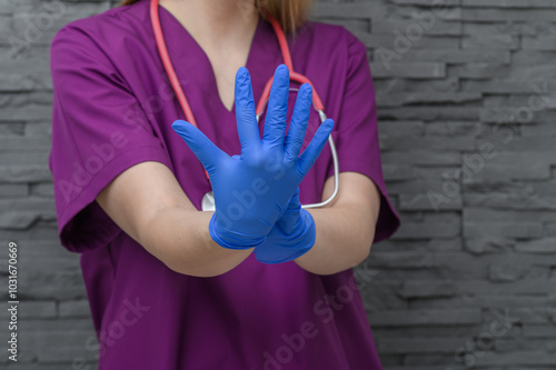 CHirurżka zakłada gumowe rękawiczki ochronne przed operacją,