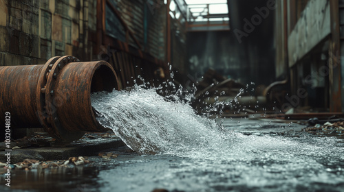 Pęknięta rura wodociągowa w strefie przemysłowej wyrzuca wodę pod wysokim ciśnieniem.