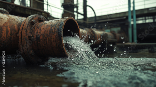 Pęknięta rura wodociągowa w strefie przemysłowej wyrzuca wodę pod wysokim ciśnieniem.