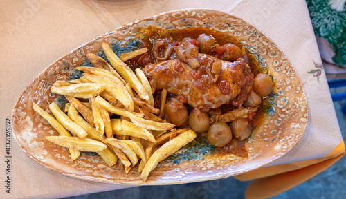 królik duszony z cebulkami, rabbit stewed with onions