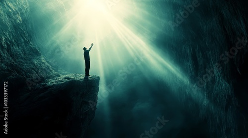 A man seeking divine assistance, standing on a steep cliff under radiant light beams
