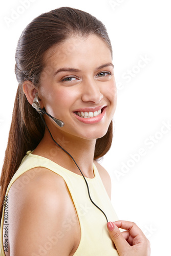 Happy woman, portrait or call center with mic for customer service in studio on a white background. Young, female person or consultant with smile for telemarketing, online assistance or advice