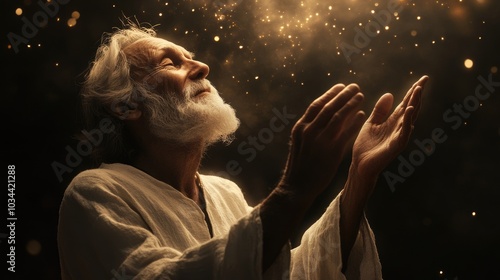 Elderly Sage Seeking Divine Mercy and Hope, Hands Raised in Prayer