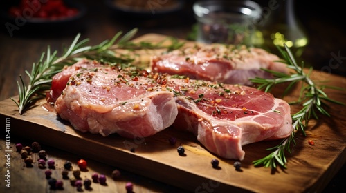 A close-up of raw pork chops with a garnish of fresh rosemary