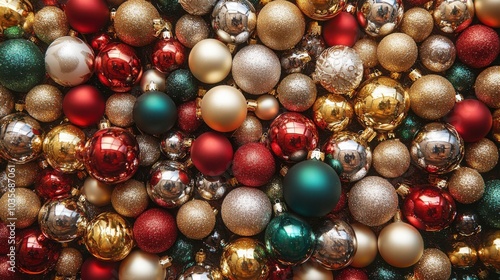 A background completely filled with sparkling Christmas tree ornaments, packed closely together to create a festive, shiny surface.