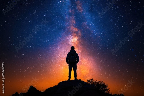 Silhouette of a man gazing at the Milky Way. Perfect for illustrating concepts of exploration, wonder, and the vastness of the universe.