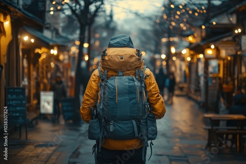 Man with a backpack walking down a street, travel
