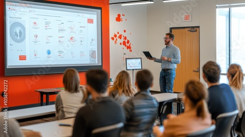 A speaker engages the audience while presenting a digital marketing plan using a large screen in a contemporary classroom
