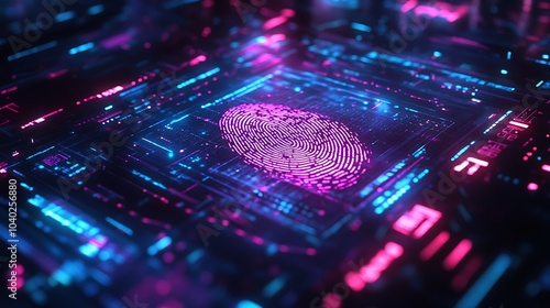 Fingerprint being scanned by an augmented reality interface, holographic data projections and glowing biometric details, neon blue and purple lighting in a dark setting, sleek futuristic design,