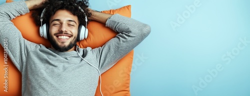Un jeune homme avec une barbe, allongé sur un oreiller orange, écoutant de la musique avec un casque, souriant et heureux, fond bleu en arrière-plan, image avec espace pour texte.