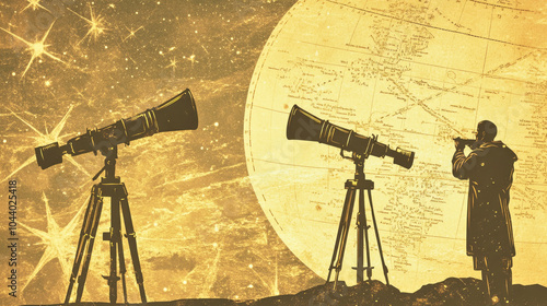 Ancient astronomers observe Venus with telescopes and star maps under a vintage sky