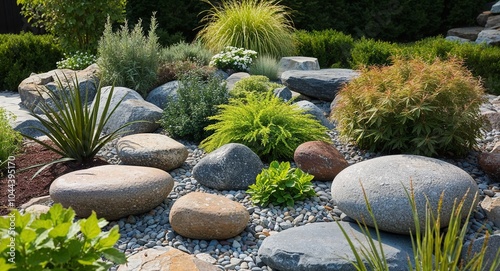 Rock garden featuring unique stones and hardy plants arranged artistically background harmonious blend of natural elements creating a calming landscape