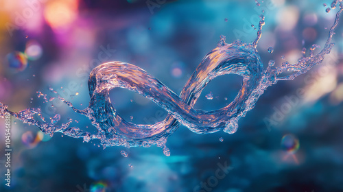 A swirling water splash shaped like an infinity symbol, with tiny rainbows emerging from where the water curves and breaks.