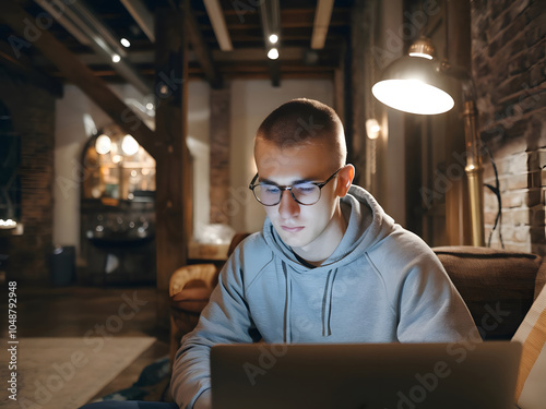 Estudiante concentrado mira intensamente la pantalla de una computadora portátil por la noche