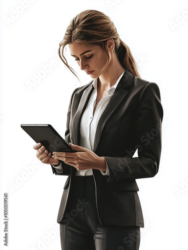 Mujer de negocios con un tablet en la mano, fondo liso blanco, vista de cuerpo entero