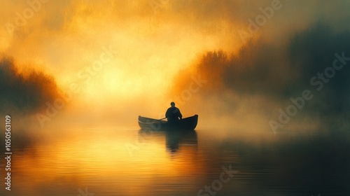 A lone figure rows a boat across a misty lake at sunrise. The sky is ablaze with orange and yellow light, creating a sense of peace and serenity.