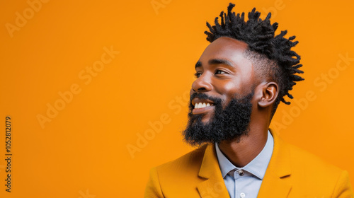 Bright and cheerful portrait of a joyful afro guy against a vibrant orange backdrop, exuding warmth and positivity.
