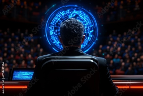 Cyberpunk witness in a neon-lit courtroom with digital screens displaying case details, showcasing a high-tech future approach to testimony, symbolizing intensity and progress