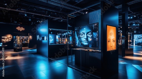 Modern exhibition booth with a modular design, dark background, and interactive features, offering a stylish and immersive brand experience.