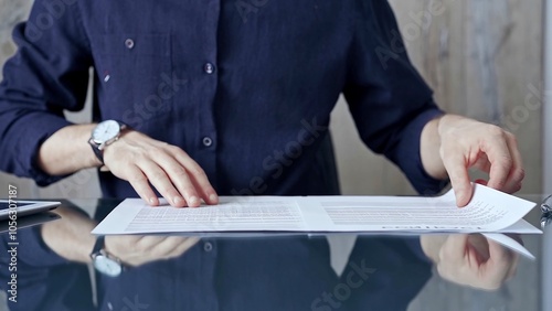 Businessman in dark blue t-shirt analyzing document at desk. Close-up of a professional auditor or lawyer reviewing a lengthy paper report in office setting. Business people concept
