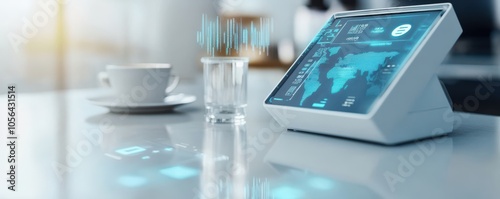 Modern digital tablet with interactive features on a stylish table, accompanied by a coffee cup and glass of water, enhancing productivity.