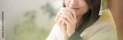 冬のリビングで温かい飲み物を飲むくつろぐ、リラックスする若い女性のクローズアップバナー 顔無し