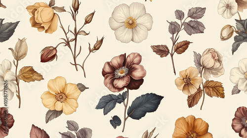 Wzór tła ukazuje bogactwo kwiatowych ilustracji, z misternie narysowanymi liśćmi i kwiatami w stonowanych kolorach.