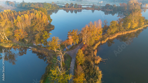 Milickie Ponds at sunrise, bird's eye view, Lower Silesian Voivodeship, Poland