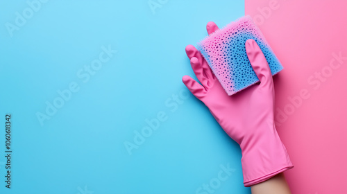 Na pastelowym tle widać gąbkę do czyszczenia trzymaną w ręce w różowej rękawicy
