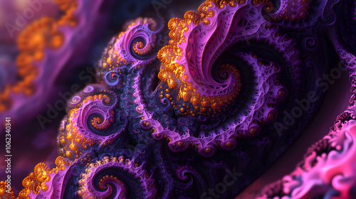 A vibrant fractal design with intricate spirals in purple and orange hues, set against a dark cosmic background for a mesmerizing effect.