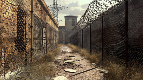 Widok na korytarz w więzieniu pokazuje długi dziedziniec otoczony wysokimi ogrodzeniami.