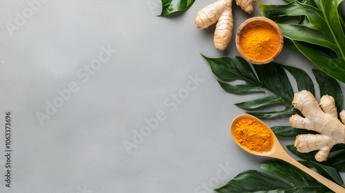 Flat-lay compositions with minimalist style, neutral gray background highlights the vibrant colors of turmeric, ginger and greenery. Concept of healthy living and nutrition, natural beauty and wellnes