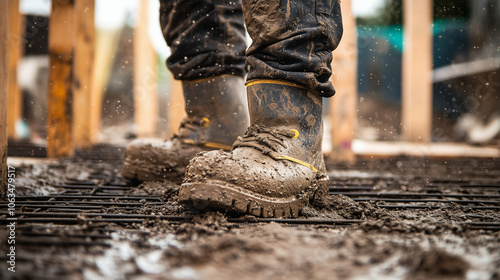 W dolnej części kadru widać nogi pracownika budowlanego, ubranego w robocze spodnie i solidne buty ochronne, stojącego na placu budowy.