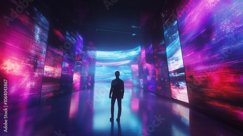 テクノロジーやAIの進化を感じさせるインタラクティブな体験空間を歩く人物