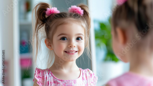 Młoda dziewczynka stoi przed lustrem, analizując swoje odbicie.