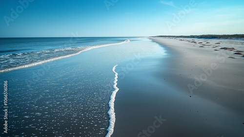 beach where fine sand meets gentle waves, showcasing a natural curve, wet sand, scattered shells, and driftwood, with an ocean gradient from light to dark blue