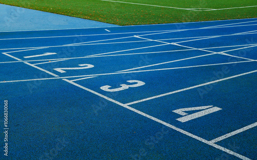 Blue running tracks with white lane markings and numbered start lines.