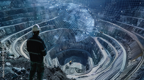 A worker observes the expansive depths of an active mine while digital projections illustrate mineral deposits overhead, showcasing modern mining techniques in real time
