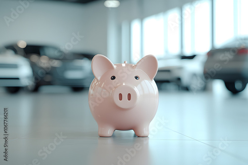 A piggy bank stands on the floor of an empty car showroom, symbolising savings and financial goals amidst the sleek, polished vehicles in the vast, quiet space