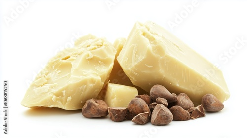 Raw cocoa butter and cocoa beans on a white background showcasing natural chocolate ingredients