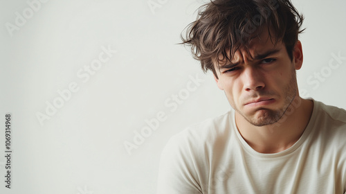 Młody mężczyzna z niezadowoloną miną wyróżnia się na białym tle.