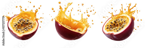 Fresh passion fruit halves with vibrant pulp and juice splashes create dynamic and colorful display. juicy interior and lively splashes evoke sense of freshness and vitality