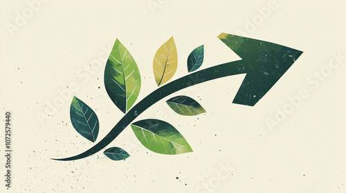 Strzałka z zielonymi liśćmi symbolizuje rozwój inwestycji społecznych w odnawialne źródła energii, podkreślając rolę technologii w przyspieszaniu zmiany na lepsze.
