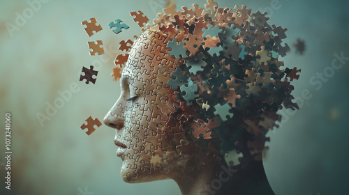 Ludzka głowa w profilu, której mózg, przedstawiony jako układanka, powoli się rozpada, co symbolizuje postępującą utratę pamięci i zaburzenia poznawcze związane z demencją i chorobą Alzheimera.