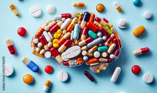 Artistic depiction of human brain made from assorted medication pills.